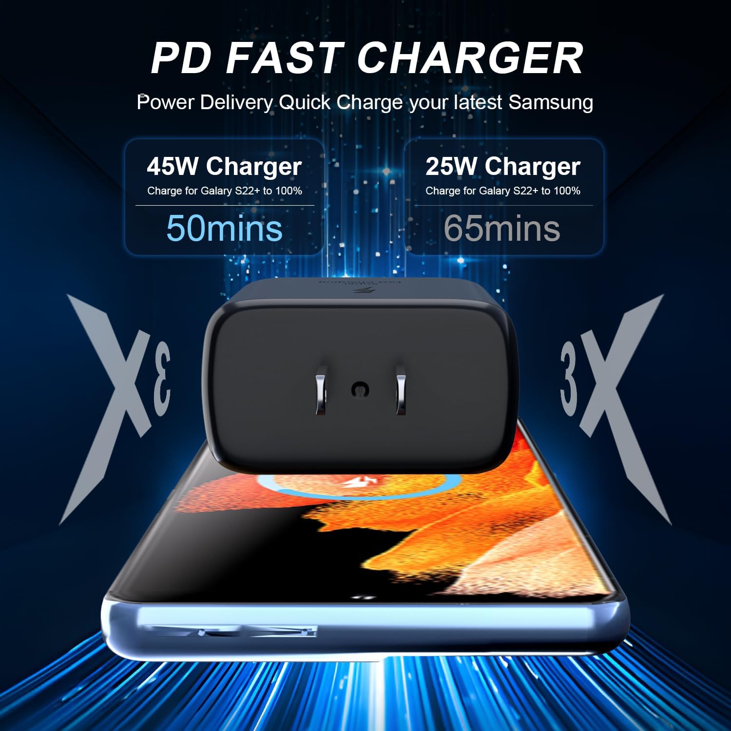 【For Galaxy Charger Fast Charging】45 Watt Max, Fast Charge 2.0; High speed charging! Super fast charge for Galaxy S24 Ultra from 0% to 50% in just 25 min, saving over half of hour than 25w super charger.Faster than 20W and 25W chargers.
