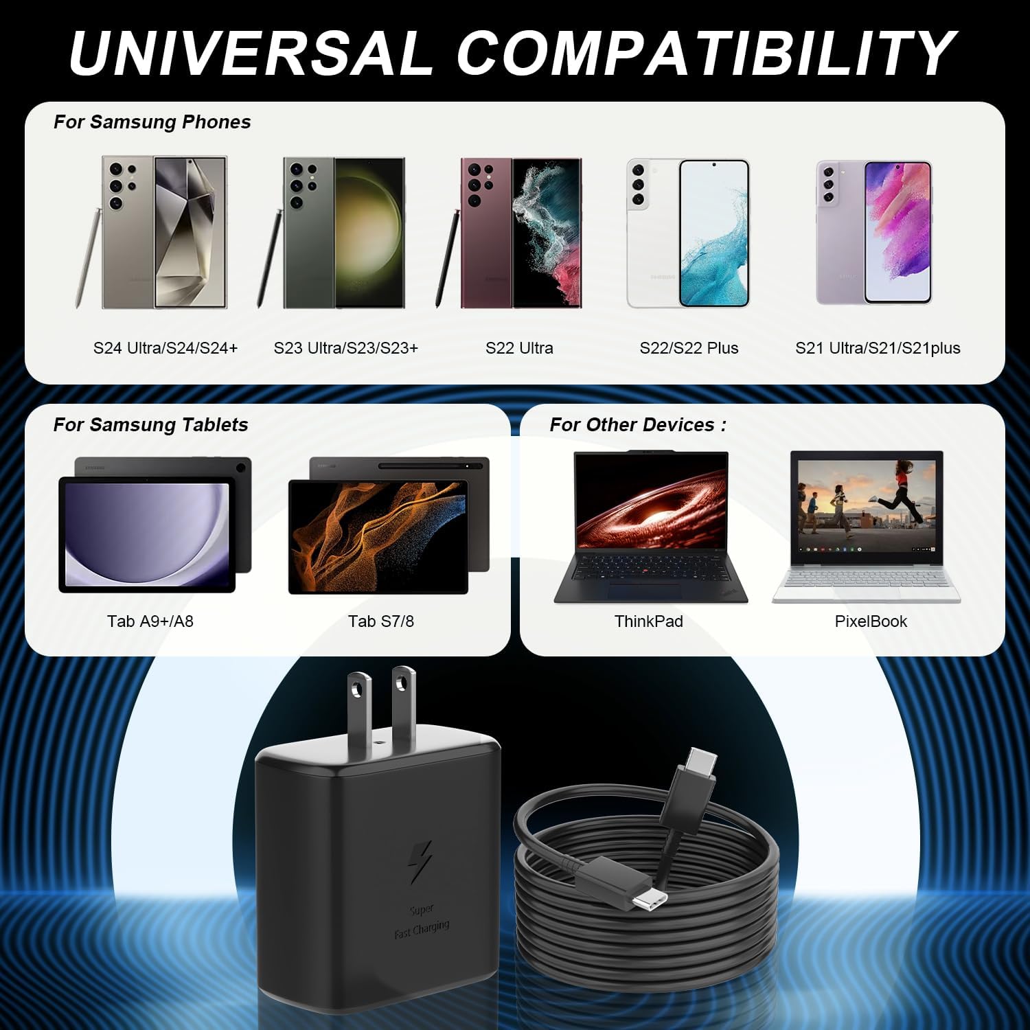 【Compatible with Galaxy Models】45W phone charger super fast charging Galaxy S24 Ultra, S24, S24+,S23 Ultra, S23, S23+, Galaxy S22 Ultra, S22, S22+, S21 Ultra/ S21/ 21+/ S20 Ultra,Galaxy S20/ S20+/ S20 FE, Note 20/ 20+/ 10+/ 10+ 5G/ S10 5G, Note 10/ 9/ 8,Galaxy Tab S7/S7+/S8/S8+/S8 Ultra,Z Fold 4/ Z Flip 4, Galaxy A91, Galaxy Z Fold 3 5G, Pixel 5 / Pixel 4xl, other USB C devices and more future compatible devices.